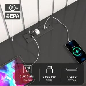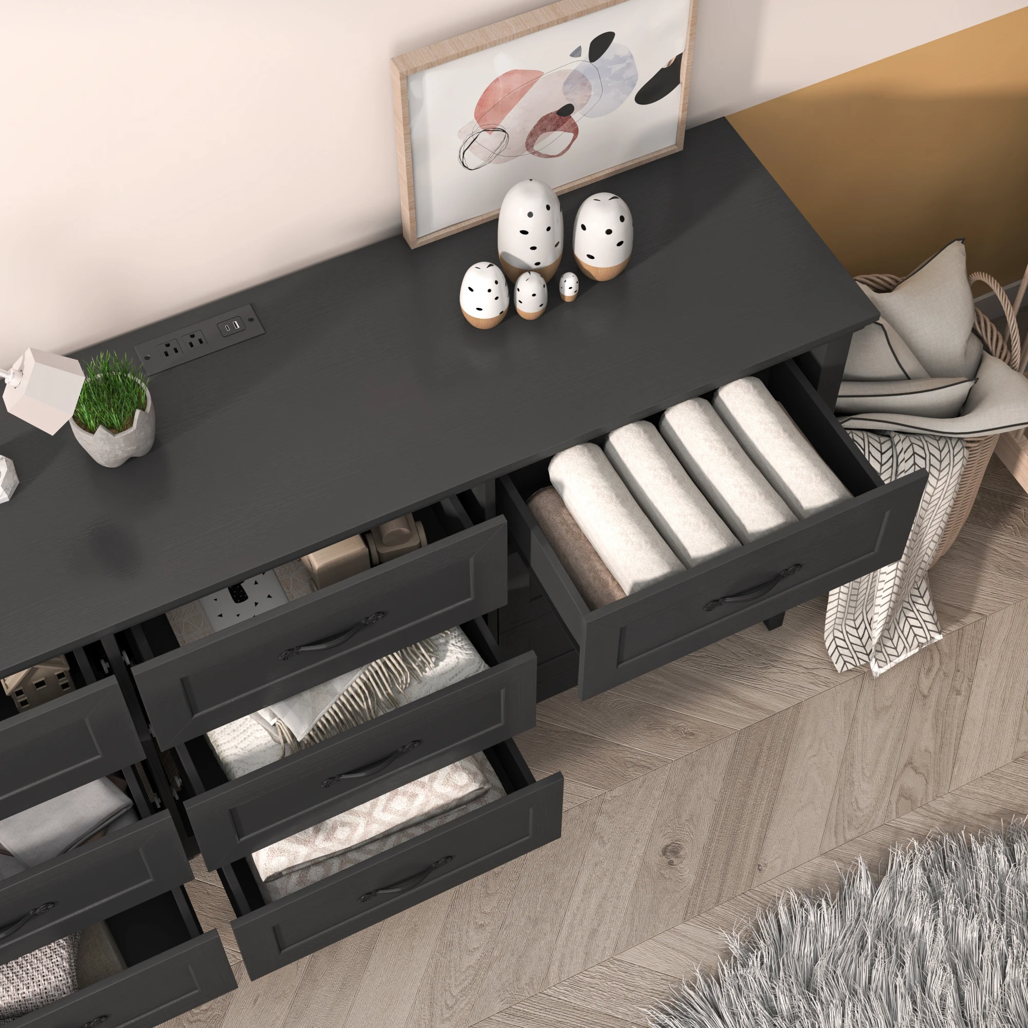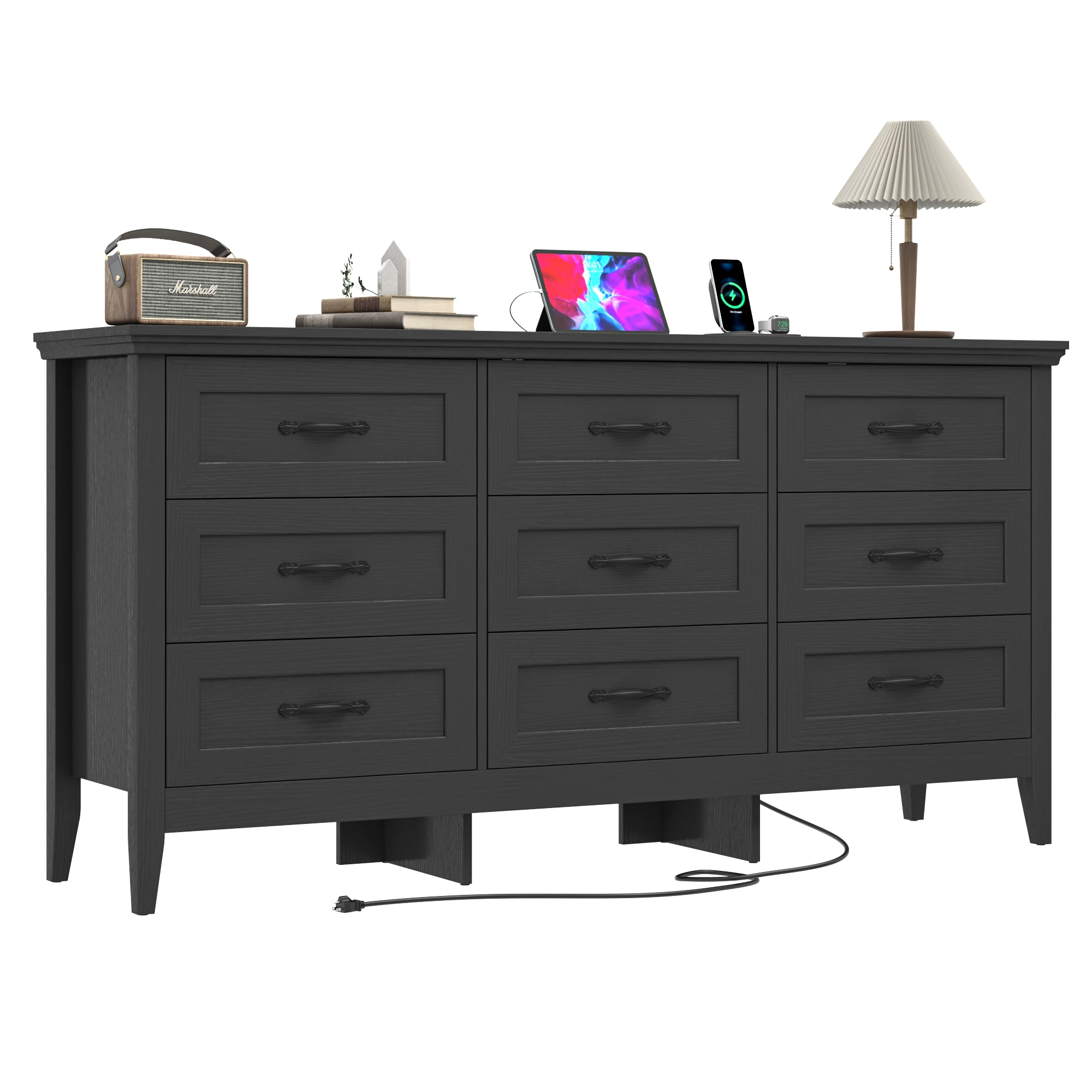 【Dresser with Charging Station】Dresser have 2 AC outlets, 1 USB ports and 1 type C , charging is super easy. Multiple devices such as mobile phones, headphones, watches, laptop, or table lamp, etc. can be charged at the same time.