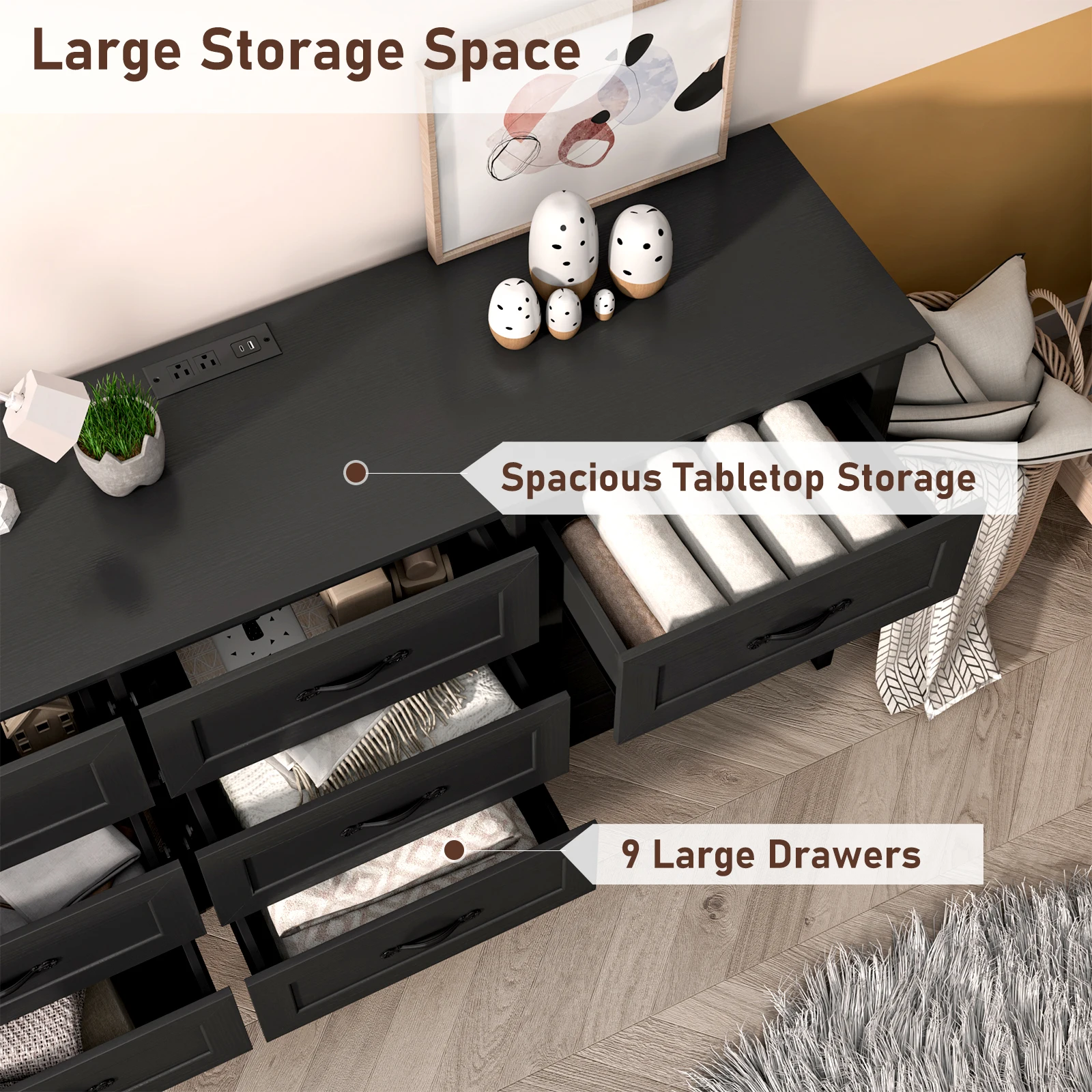 【Ample Storage Space】With 9 spacious drawers, this rustic dresser can organize anything from shirts and underwear to diaper and toys. Feel free to place it in your bedroom, nursery or anywhere you like. It can also be used as a TV stand. (Maximum load capacity of the Tabletop: 66lbs)