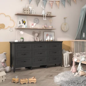 【Sturdy Structure】The wooden frame construction and thickened panels make this 9 drawer dresser more stable than others which will not deform after several years. Overall dimensions: 15.7"D x 63"W x 31.9"H.